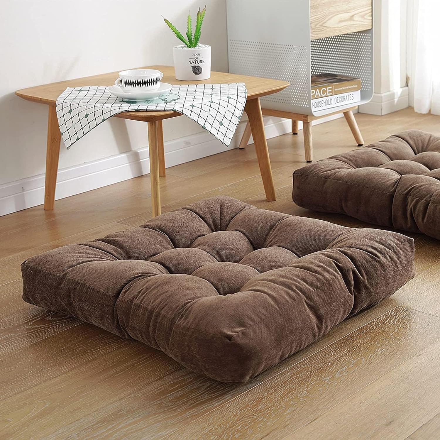 Set of 2 floor pillows crafted for comfort and style — thick tufted cushions perfect for meditation, yoga, or casual seating. Ideal for living rooms, balconies, or outdoor use. Available in Grey, Brown, or Maroon colors, size 22x22 inches.